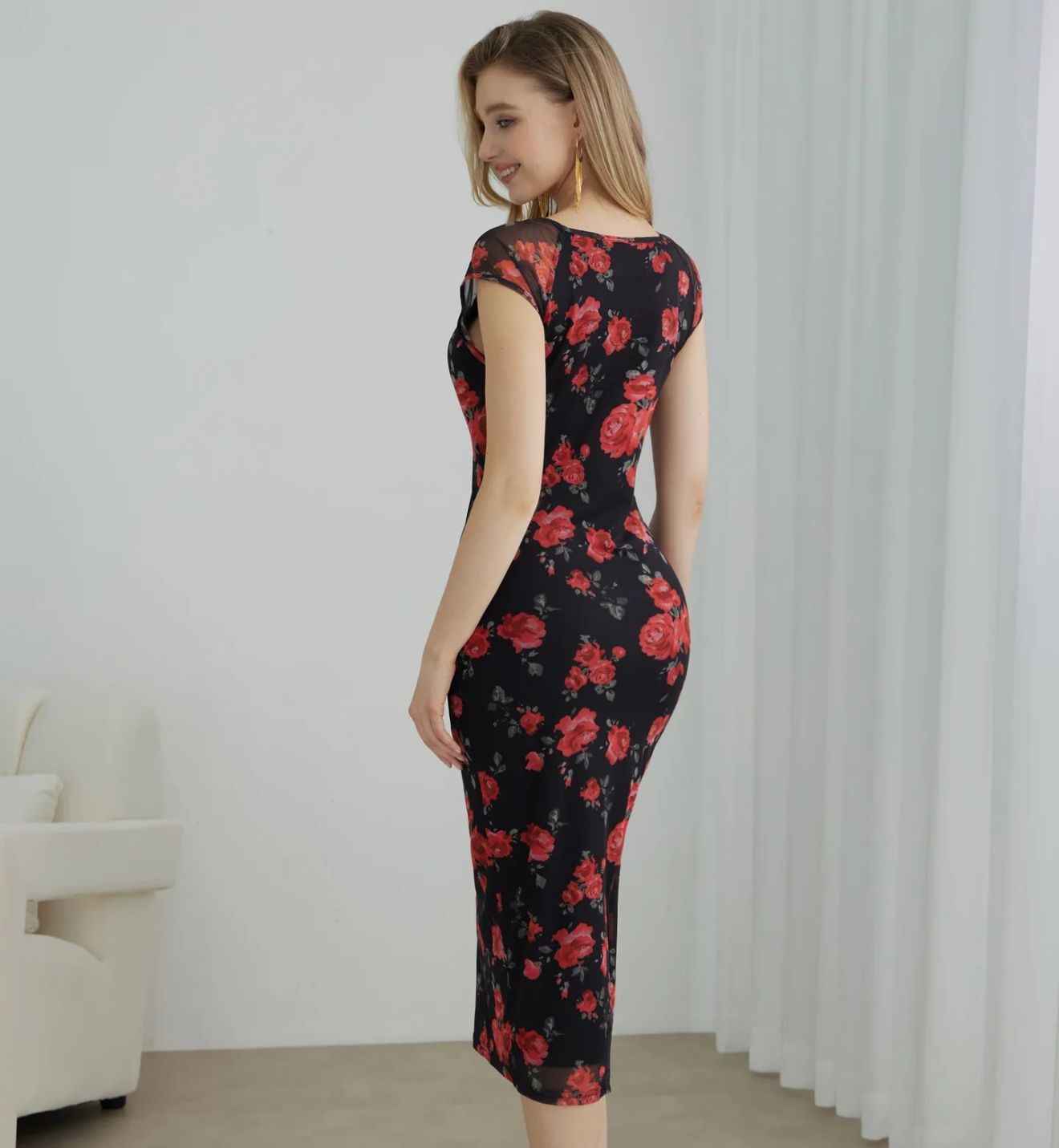 Elegant black bodycon dress with striking red floral print.