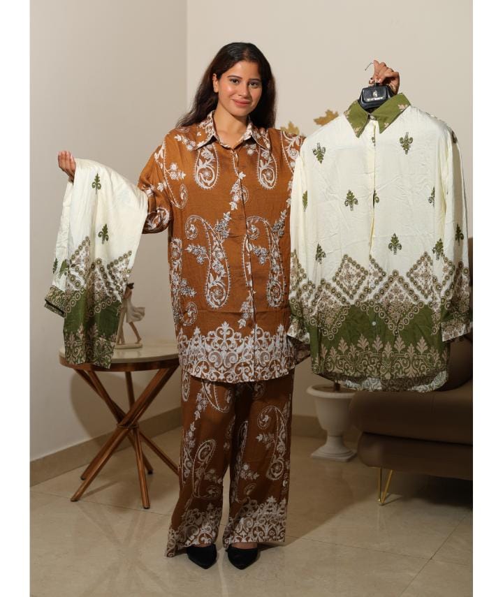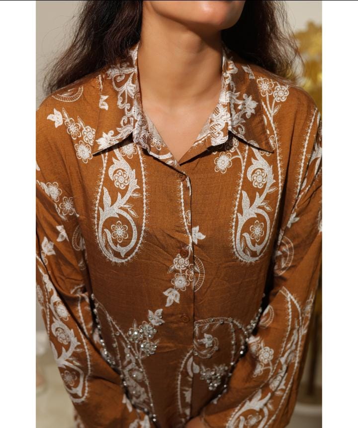 The set includes a long-sleeved shirt with a structured collar and full front button-down design. The shirt showcases an intricate paisley and floral print in white that contrasts beautifully with the rich brown base, giving it a luxe and regal vibe. The relaxed fit ensures ease of movement while offering a refined silhouette. The matching trousers are designed in a palazzo style with a comfortable waistband and the same elegant print that adds harmony to the set.