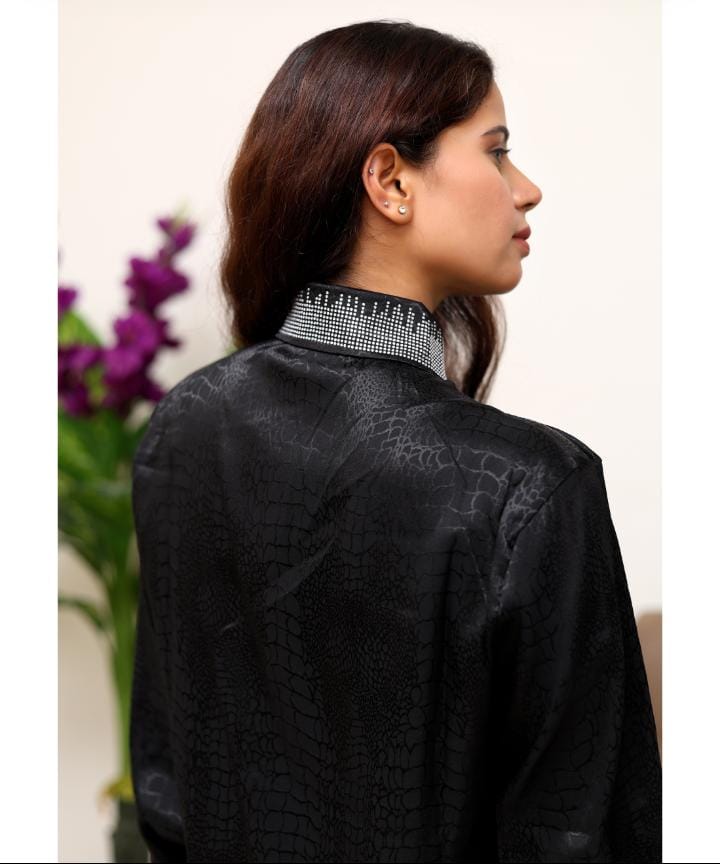 The shirt comes with a smart collared neckline and full-length sleeves, designed with a sleek, structured fit. Whether buttoned up for a refined office look or left slightly open for an effortlessly cool vibe, it adapts to your style needs instantly. The silhouette is clean, the fall is flattering, and the fabric feels soft on the skin, offering a luxurious experience with every wear.