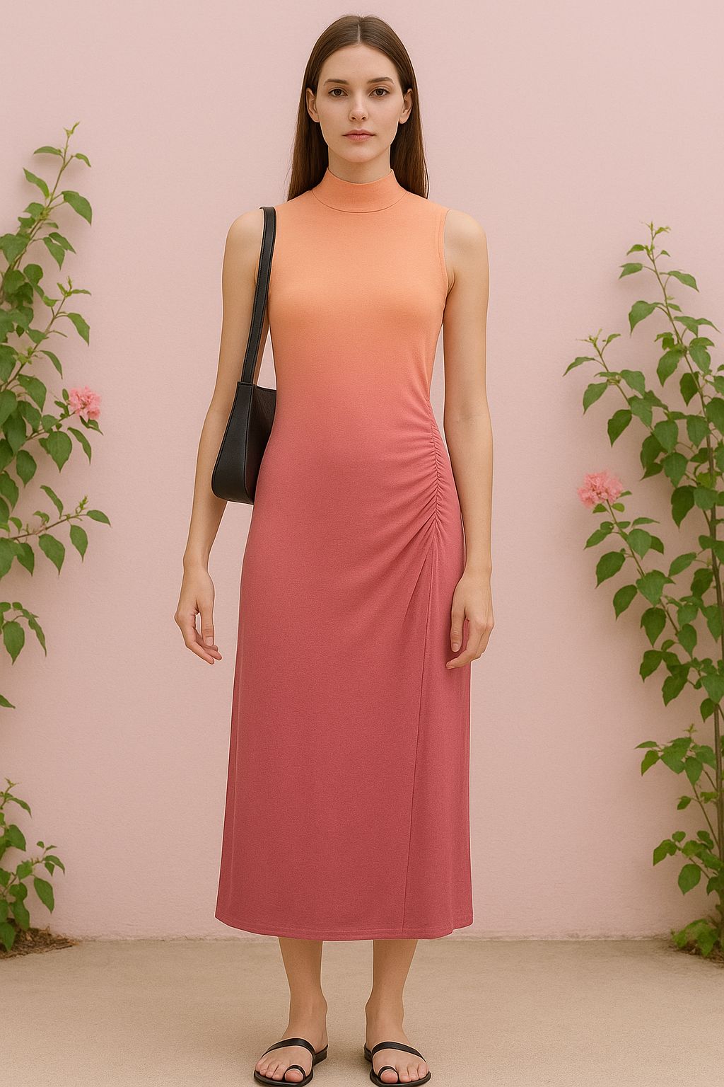 Crafted from a lightweight, breathable chiffon blend, the dress features a mesmerizing ombre effect that transitions seamlessly from a delicate peach at the bodice to a rich pink at the hem. The gradient evokes the beauty of a summer sunset, making it a perfect choice for garden parties, beach weddings, brunch dates, or any occasion where you want to glow with natural elegance.