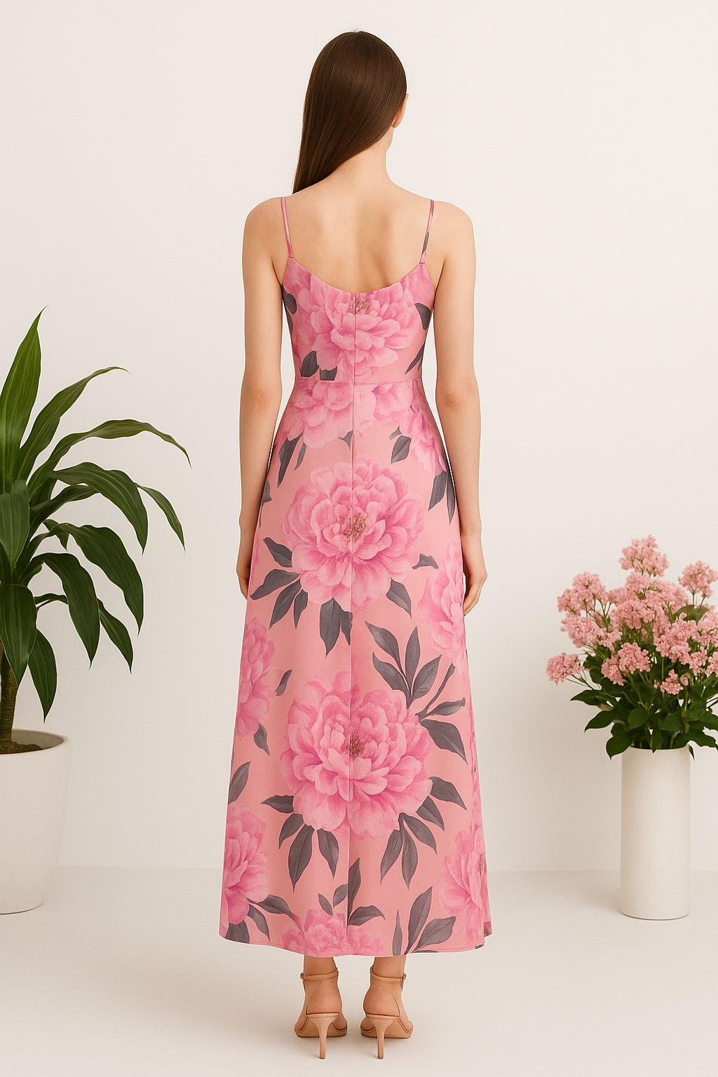 The pink floral design makes this maxi dress versatile and season-friendly, ideal for spring and summer events, though equally striking for evening parties or weddings when styled with the right accessories. Pair it with delicate sandals and minimal jewelry for a daytime look or elevate it with heels and statement earrings for a glamorous evening appearance.