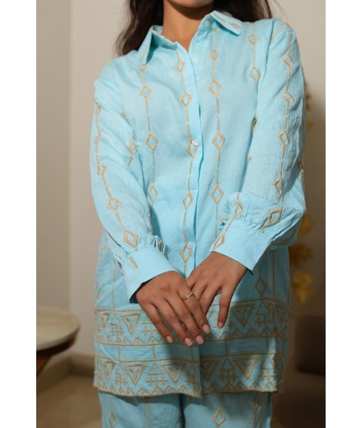 The sky blue color radiates cool and calming vibes, while the subtle beige geometric and tribal motifs give it a classy ethnic flair. The shirt features a button-down front, structured collar, and full sleeves with soft gathers, making it effortlessly versatile. The hem and cuffs are adorned with detailed border prints that elevate the aesthetic appeal of the outfit.