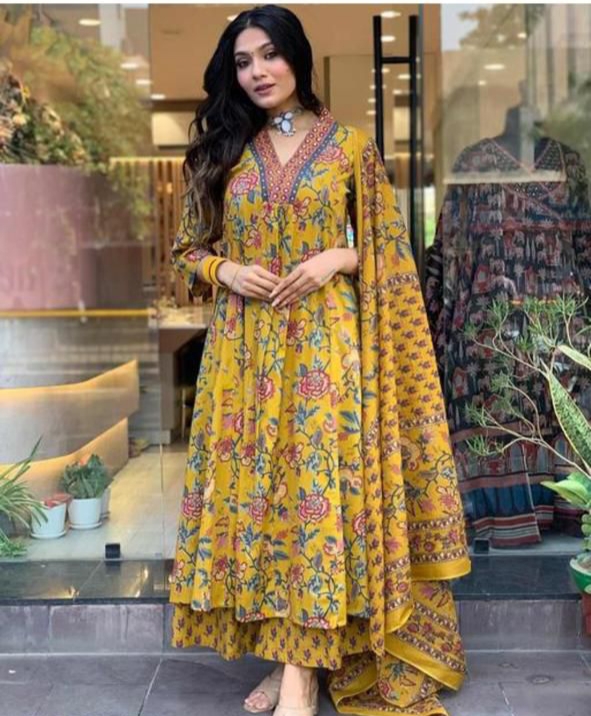 Crafted from premium-quality fabric, this yellow Anarkali suit features intricate floral patterns that exude freshness and vibrancy. The soft yellow hue symbolizes joy and positivity, making it the ideal choice for festive occasions, family gatherings, or daytime celebrations. The flowy Anarkali silhouette adds regal volume and movement, giving you a graceful and flattering look with every step.